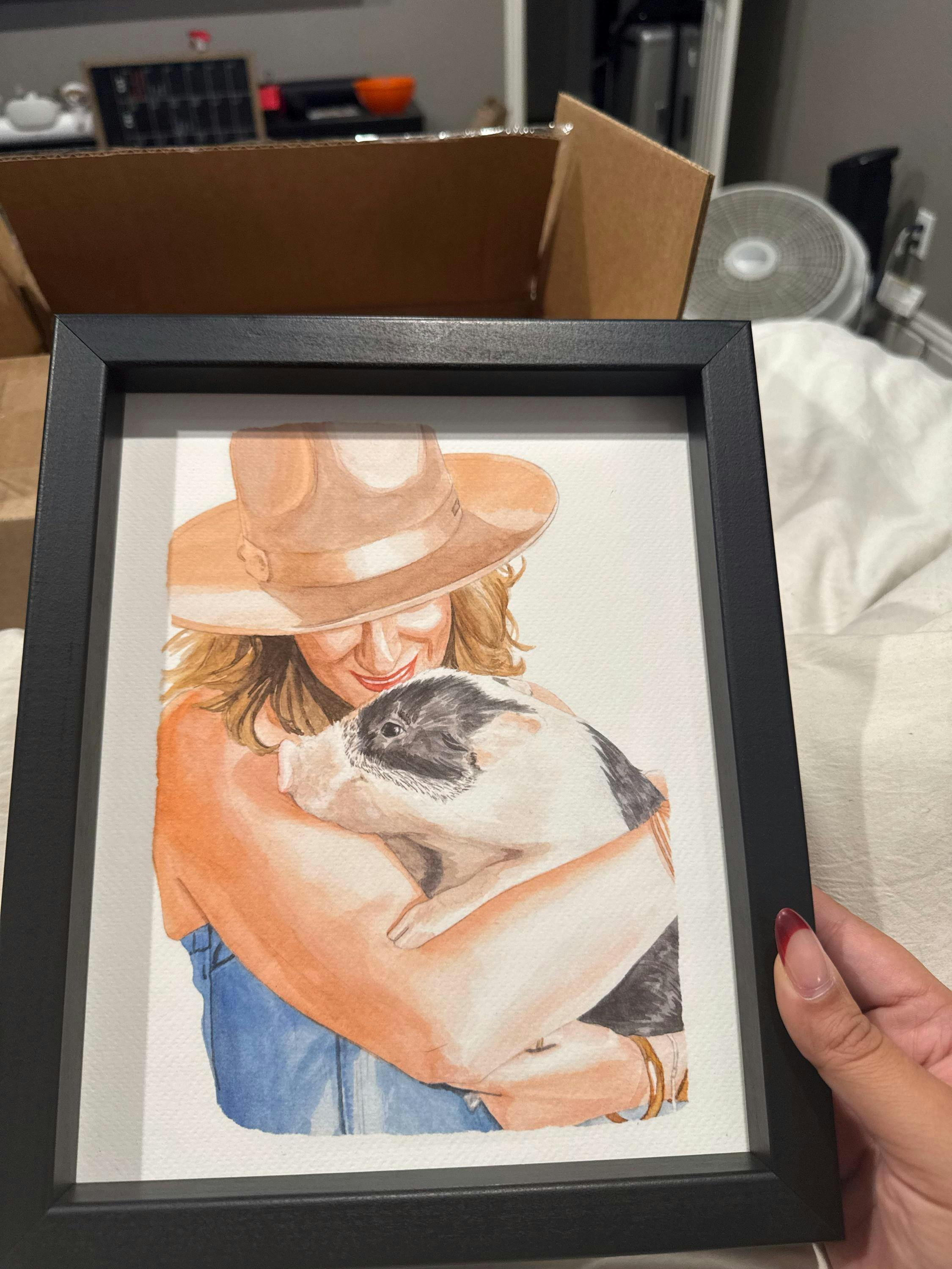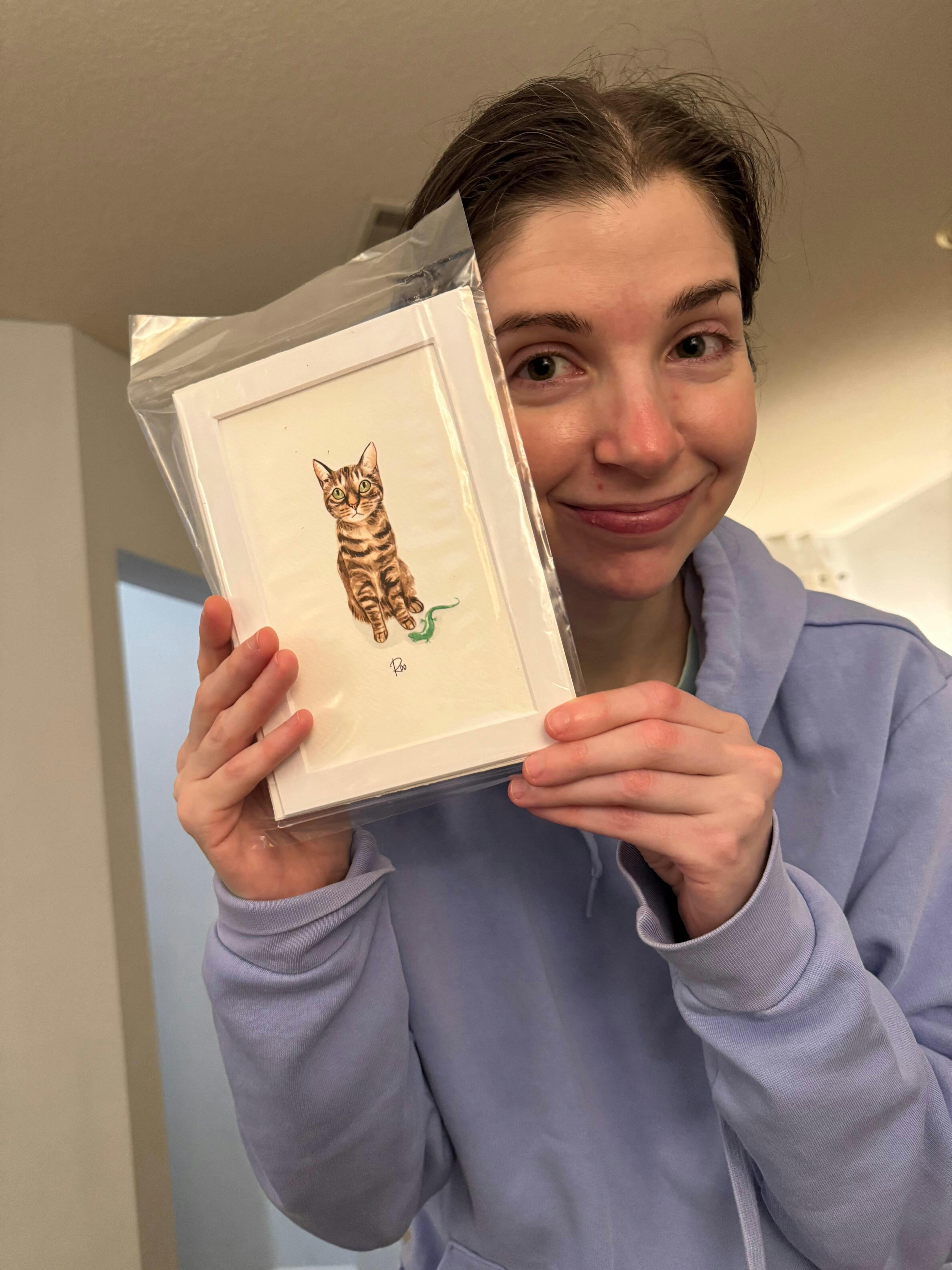 This watercolor portrait of Roux was a gift for my daughter on her birthday. When she opened the gift and saw it was through she was so shocked and surprised and very much happy with how it turned out. She said it was the best gift ever. I’m very happy with the quality and the exactness from the photo that I sent. I even requested that her toy lizard would be included and that she has green eyes. All of my request was granted and I couldn’t be happier with this product. Thank you so much for making my daughter‘s birthday a happy one.